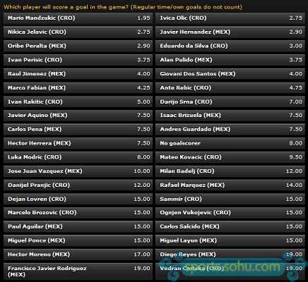 进球赔率排在前三位的均为克罗地亚球员,曼朱基奇的进球赔率最低,为1.95,奥里奇和耶拉维奇的进球赔率同为2.75。墨西哥球员进球赔率最低的是小豌豆埃尔南德斯和佩拉尔塔,赔率同为2.90。