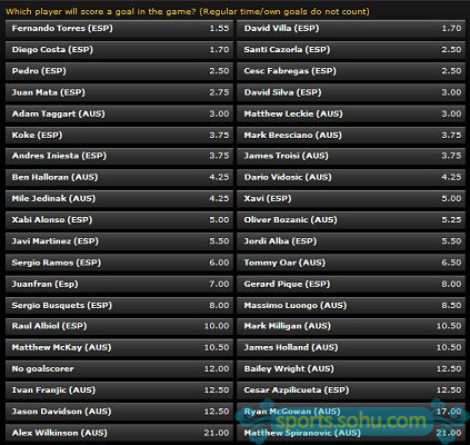 进球赔率排在前八位的均为西班牙球员,托雷斯的进球赔率最低,为1.55,比利亚、迭戈-科斯塔的进球赔率同为1.70,卡佐拉、佩德罗、法布雷加斯的进球赔率同为2.50。