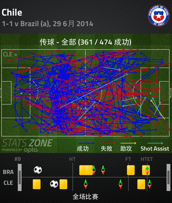 下面来看智利队的战术。本场桑保利屯兵中场,踢起3-4-1-2战术。他的意图非常明确,那就是同巴西队在中场拼刺刀。只要将皮球能够限制在中场,那么己方的球门就能够少受到威胁。在这样的思路指导下,智利队全场控球率达到51.5%,比巴西还要多出3个百分点。除此之外,巴西的传球成功率仅有73%,智利队的也仅有76%,两队的传球成功率都如此之低,毫无疑问,这是双方过多的进行中场绞杀的结果,同时也是双方冲吊战术的反映。